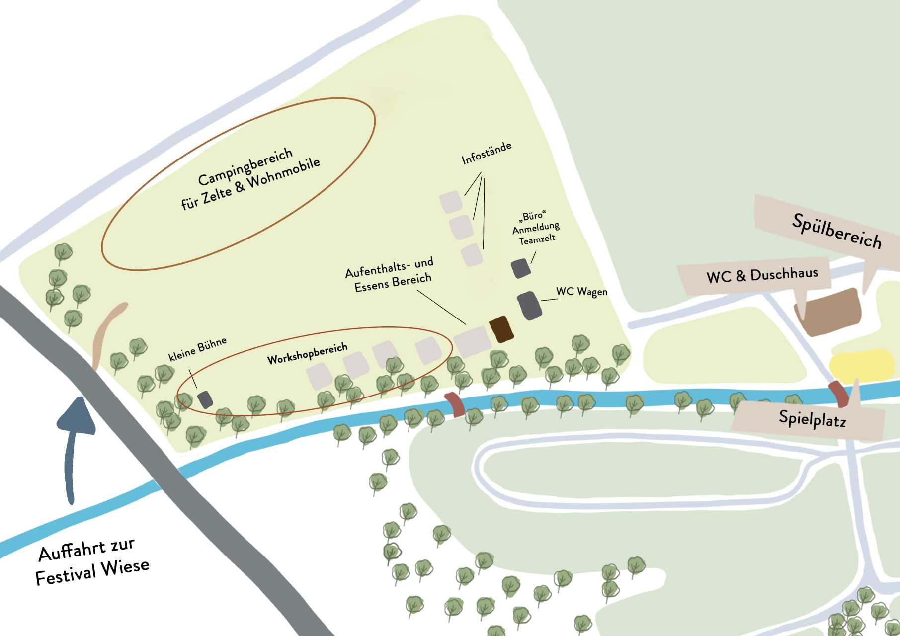 • Wenn ihr mit dem Camper oder Auto kommt, könnt ihr direkt über eine kleine Seitenstraße auf die Wiese drauffahren (siehe Lageplan). Hier die Google Maps Verlinkung für die Zufahrt der Wiese. Im Camping Bereich können sowohl die Camperbusse, als auch die Autos mit denen ihr anreist und eure Zelte stehen.