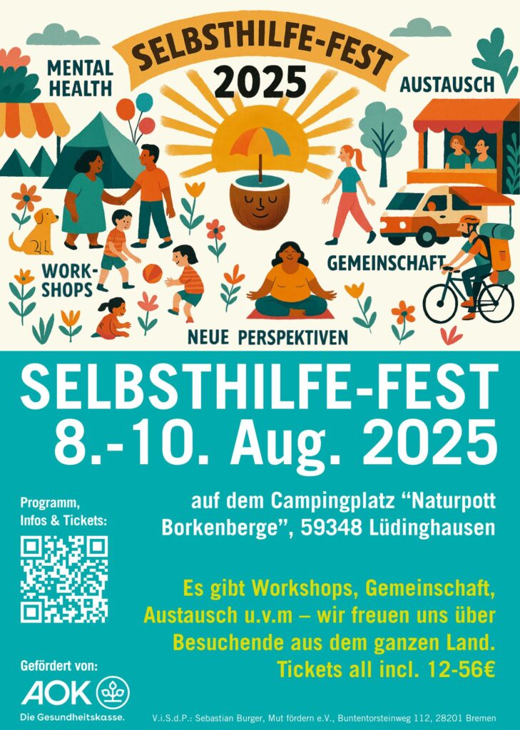 Die Krankenkassen AOK und Barmer finanzieren aller Voraussicht 2026 eine Re-Konzeptionierung des ersten Selbsthilfe-Fest 2025 und eine weitere Durchführung als Selbsthilfe-Fest 2027. Näheres folgt an dieser Stellen bis Spätsommer 2026. Wir gehen momentan davon aus, dass es 2027 wieder im Sommer so zentral wie möglich (NRW, Hessen, Thüringen!?) stattfinden und für 200-300 Leute ausgelegt sein wird. Wer Infos dazu zugeschickt bekommen möchte, kann sich gerne schon auf eine E-Mail-Liste für diesen Zweck setzen lassen: